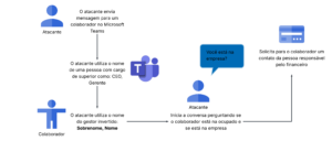 Identificamos um aumento de tentativas de Engenharia Social através do Microsoft Teams. Os contatos suspeitos iniciam conversas com mensagens genéricas, como “Você está ocupado(a)?” ou “Você está na empresa?”, e solicitam informações ou o contato do departamento financeiro.